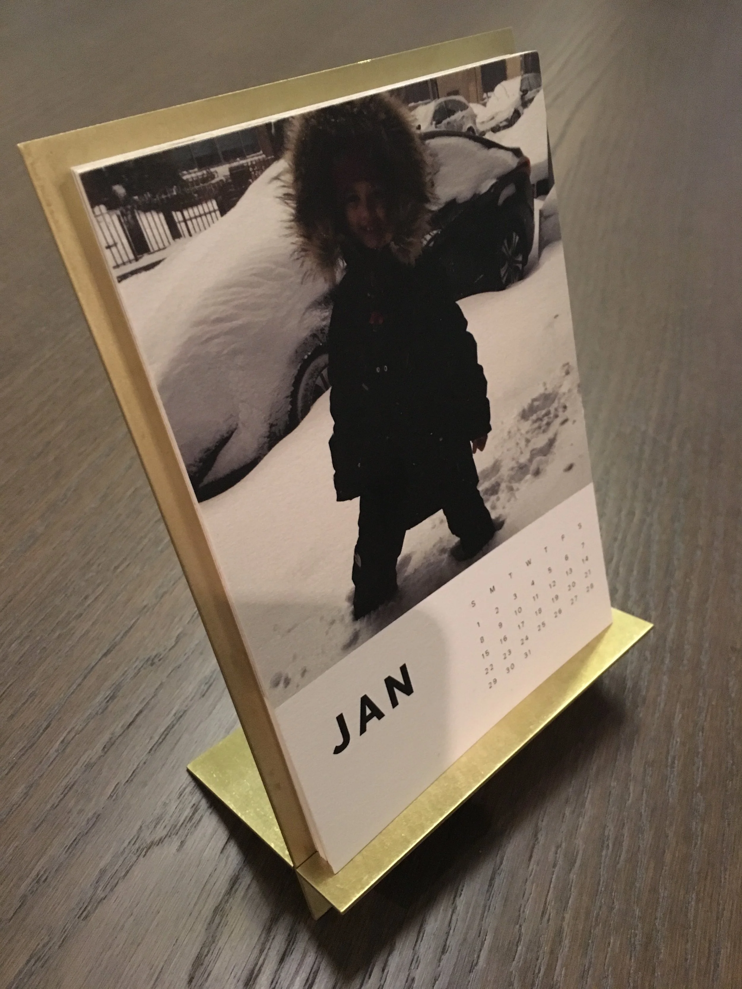 From Artifact Uprising: This stand-alone piece artfully combines a solid brass easel with premium quality papers to bring you a beautifully unique desk or tabletop display. Just add 12 of your favorite photos in the calendar design of your choice; gift it or enjoy all year round.