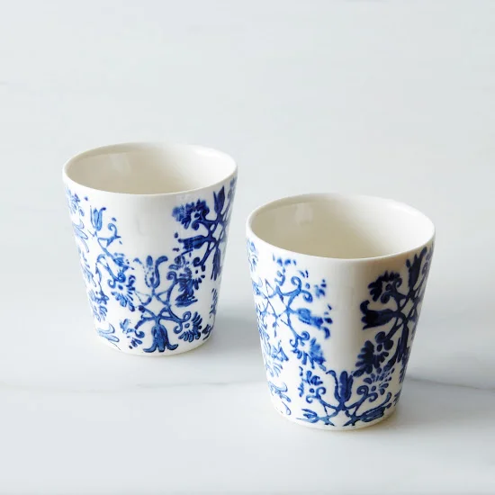 The ceramic cup is 2.25" x 1.75". The maple stand is 3" x 3".